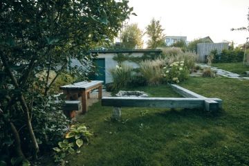 … Chodí se tu „naboso“, odpočívá, stoluje, štípá dříví, chytají lelky, běhá, na každém kroku je něco k sezobnutí. Z okna je vždy vidět něco rozkvetlého… „hele ta růžová bambule“. V zastíněném koutu vznikla malá dřevěná terasa, která se doplnila moderním lehkým mobiliářem.