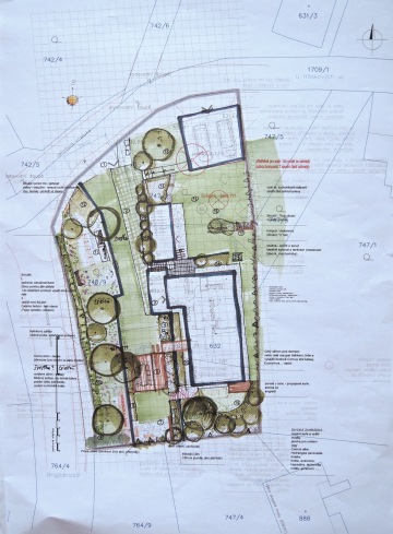 Zahrada ve svahu byla nenásilně zmodelována, aby byla získána základní rovina před vstupem do domu, vznikly prostupy mezi domem a zahradním domkem, extenzivní schody na spodní divokou zahrádku, kde se poránu cvičí a „vítá slunce“…