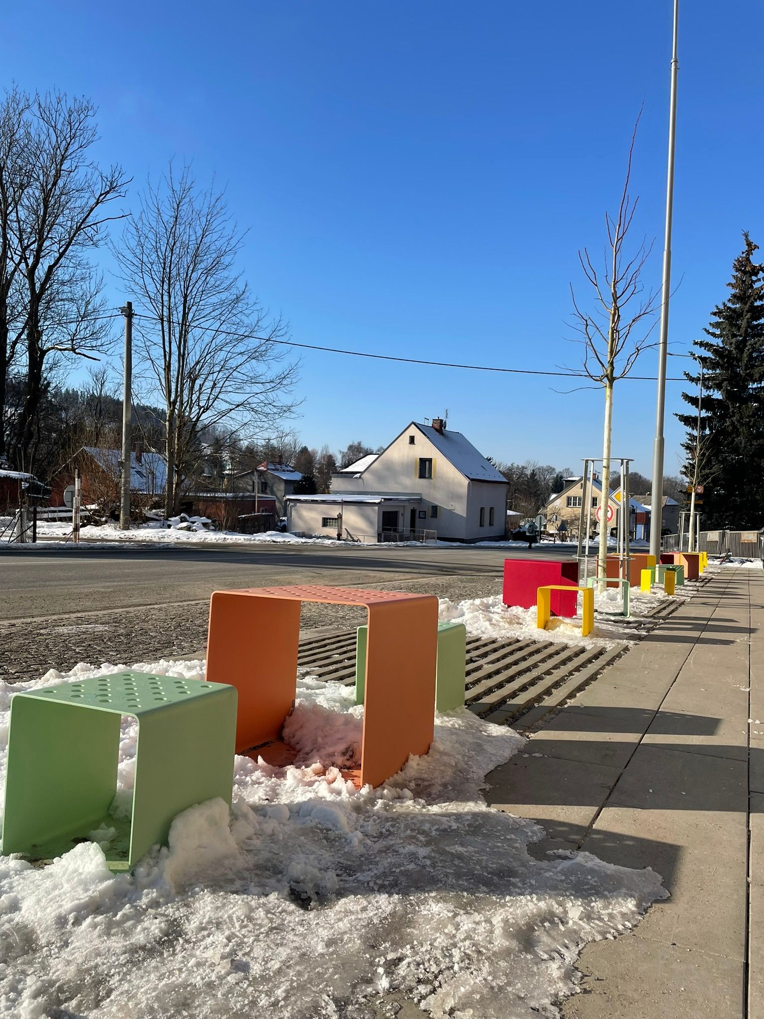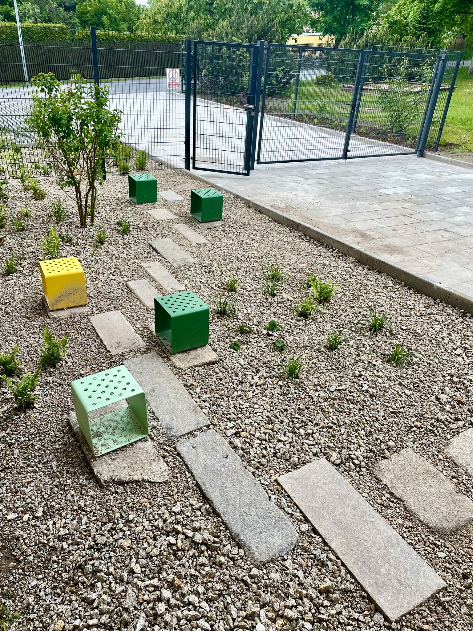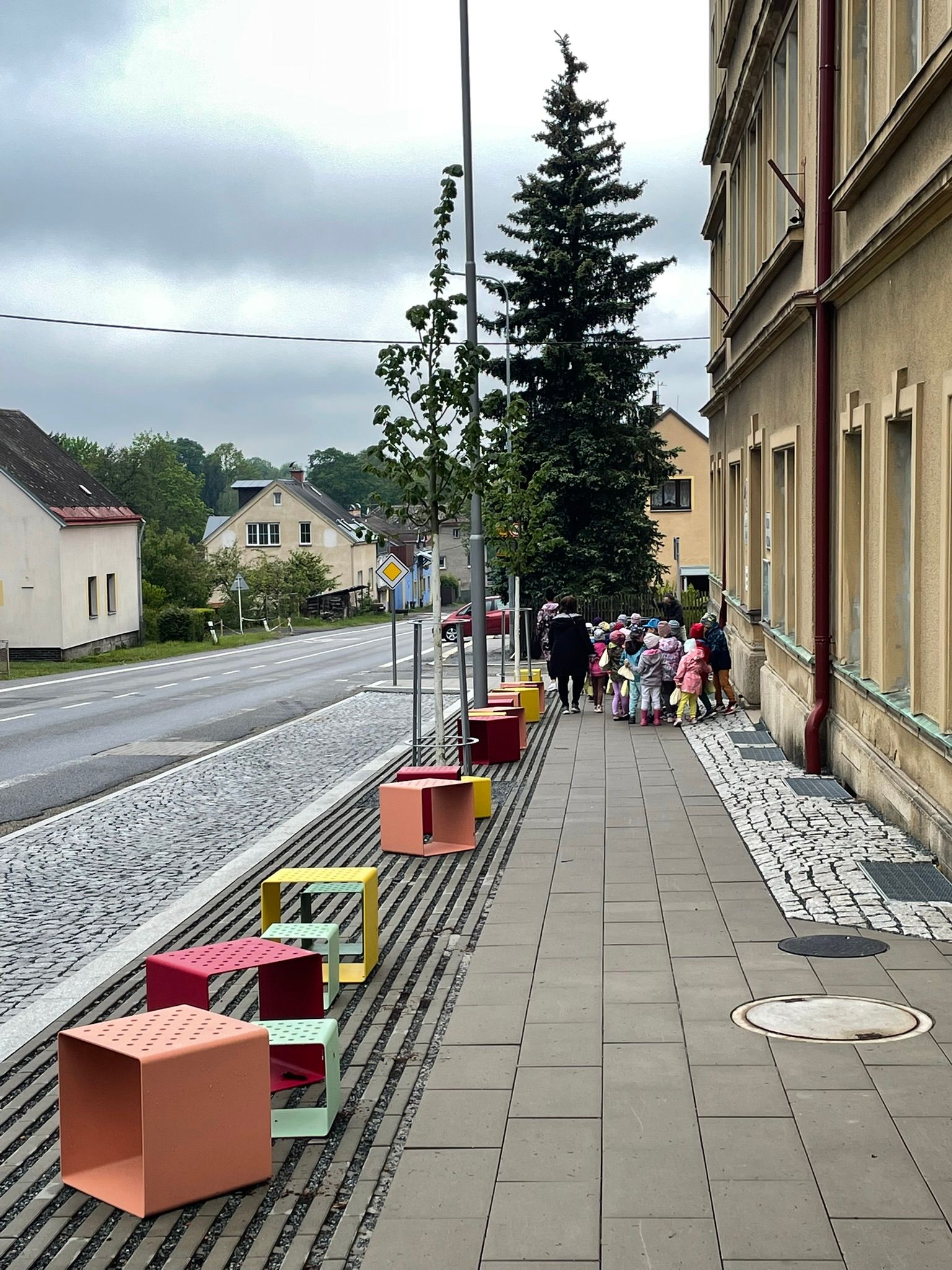 Podle návrhu KAM Jablonce nad Nisou se doplnil mobiliář - barevné sedací kostky a dřevěné lavičky, aby si děti měly kde odpočinout nebo počkat na kamarády; nová dlažba celé místo velmi pozvedla. Úpravami prošel také dvůr – vznikla nová parkovací plocha pro učitele, vjezd do zahrady i menší prostor se zelení a hravými kostkami.